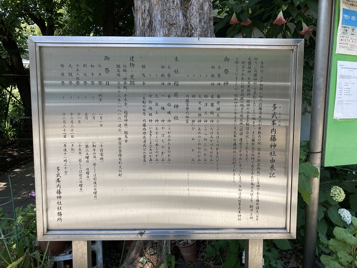 当社は、江戸初期に初代内藤清成氏が屋敷内の地(現在の新宿御苑)に家祖である藤原鎌足公を祀り、(内藤神社)を草創したことに始まり、また藤原氏の氏神である奈良の春日大社より、経津主神・武甕槌神・天兒屋根神・姫神の分霊を勧請合祀してあります。明治十九年に新宿御苑の地より現在地へ移設・遷座され今日に至っています。当初は武州多武峯神社と称していましたが、昭和四十二年五月に多武峯内藤神社に改称されました。