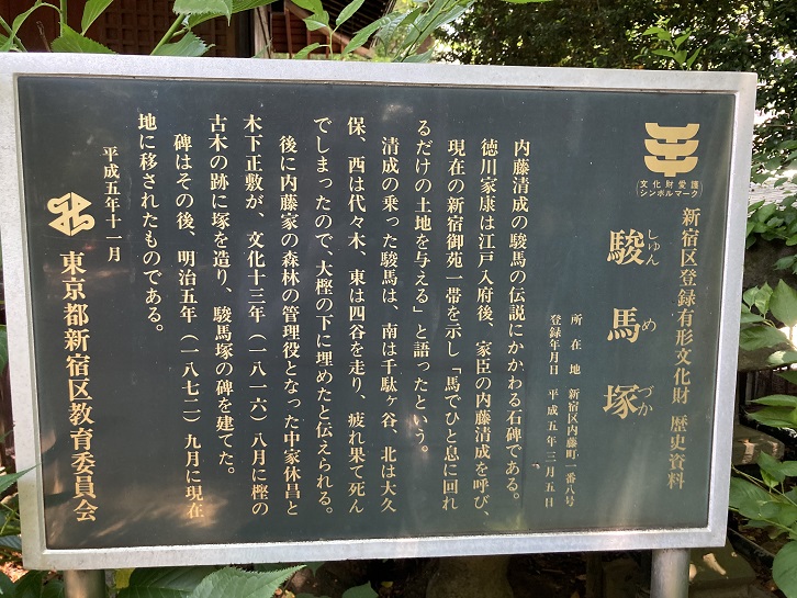 内藤清成の駿馬の伝説にかかわる石碑である。徳川家康は江戸入府後、家臣の内藤清成を呼び、現在の新宿御苑一帯を示し「馬でひと息に回れるだけの土地を与える」と語ったという。清成の乗った駿馬は、南は千駄ヶ谷、北は大久保、西は代々木、東は四谷を走り、疲れ果て死んでしまったので、大樫の下に埋めたと伝えられる。後に内藤家の森林の管理役となった中家休昌と木下正敷が、文化十三年(1816年)八月に樫の古木の跡に塚を造り、駿馬塚の碑を建てた。碑はその後、明治五年(1872年)九月に現在地に移されたものである。