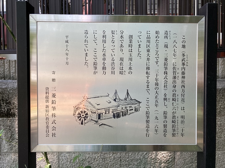 この地(多武峯内藤神社西方付近)は、明治二十年(1887年)に佐賀藩出身の眞崎仁六が眞崎鉛筆製造所(現・三菱鉛筆株式会社)を興し、鉛筆の製造を始めたところです。三十年後の大正五年(1916年)に品川区東大井に移転するまで、ここで鉛筆製造を行っていました。創業時は玉川上水の分水であり、現在は暗渠となっている渋谷川を利用した水車を動力にして、ここで鉛筆が造られていました。