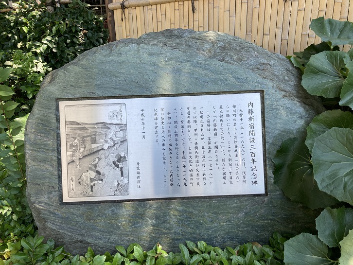 元禄十一年(1698年)六月、浅草阿部川町の名主・高松喜兵衛(後の喜六)らの願いにより、ここから新宿三丁目交差点付近までの約1kmに、新たな宿場として「内藤新宿」が開設された。この宿場は、享保三年(1718年)に一旦廃止されたが、五十四年後に再興されて以降、甲州・青梅両街道が交差する、交通の要衝として、また文化と娯楽の町として繁栄をつづけ、平成十年(1998年)、開設三百年を迎えることとなった。新都心・新宿の出発点となった内藤新宿の歴史と先人の歩みを記念し、ここに記念碑を建立する。