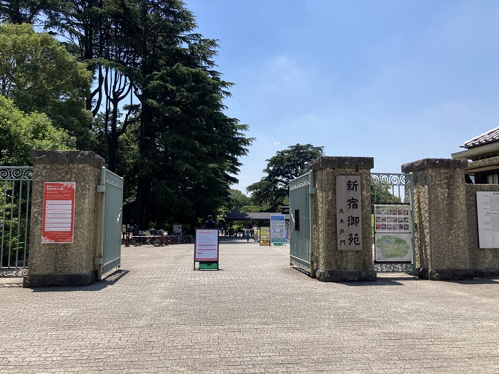 外苑西通りに出て、右折します。その先に新宿御苑正門があります。新宿御苑には、正門の他に新宿門・大木戸門・千駄ヶ谷門があります。正門は、新宿御苑がかつて皇室苑地だった頃に皇室をはじめ、国内外の賓客の入園門として設けられました。現在の新宿御苑は誰でも入園できる環境省所管の国民公園(他に、皇居外苑と京都御苑があります)になっていますので、利便性の高い場所に新宿門・大木戸門・千駄ヶ谷門の入園門が設置されています。正門は交通の便が悪いことでそれほど入園者数も見込まれないため、国の特別行事を行うときなどを除き閉鎖されています。「開かずの門」ですね。