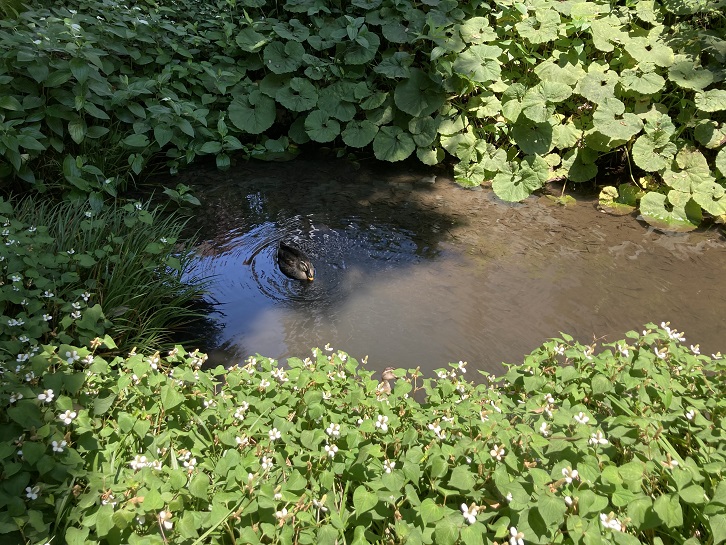 自由通路の片側には小川が造られ、水面には鴨も浮かんでいます。気持ち良さそうですね。