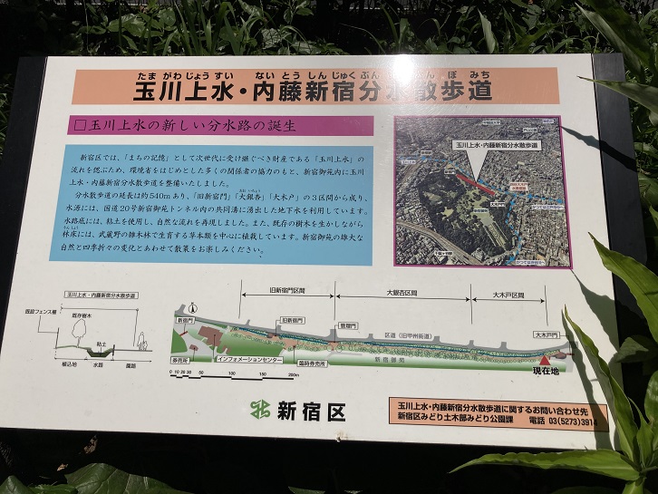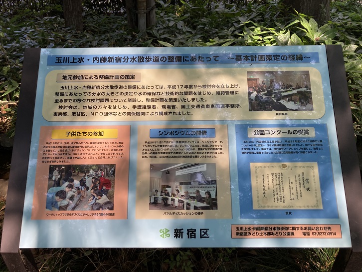 実は、この小川は単なる飾りではなく、かってここを流れていた玉川上水を再現したものだそうです。規模は比較になりませんが、案内板にはその経緯が記されています。