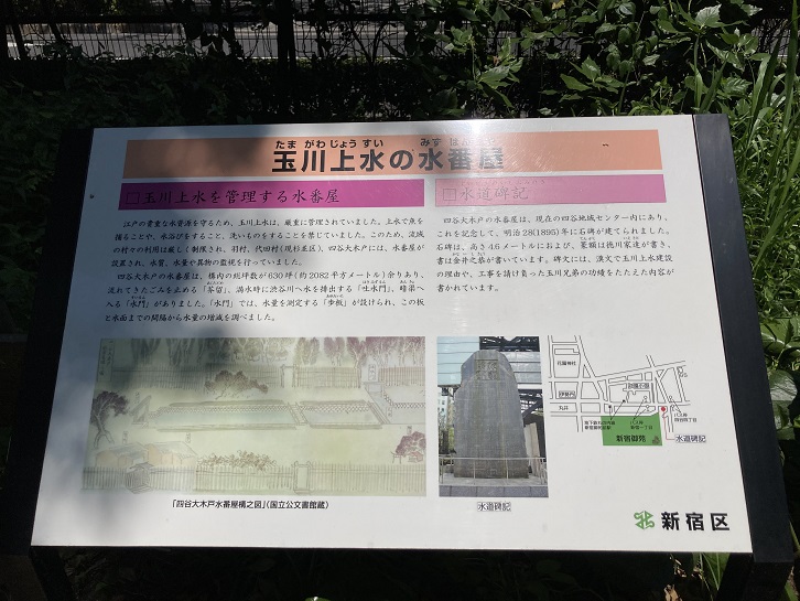外苑西通りと国道20号線が交差する四谷四丁目交差点の角に、江戸時代の水利施設について記した案内板が立っています。隣には、玉川上水が引かれた経緯を記した巨大な石碑も建っています。明治二十八年(1895年)に建立されたそうで、石碑の文字は難しい漢文で書かれています。碑文の字が小さい上に石碑が巨大過ぎて双眼鏡でも使わない限り上部の文字は読み取れませんね。全部読んで碑文の内容を理解した人はいるのでしょうか?