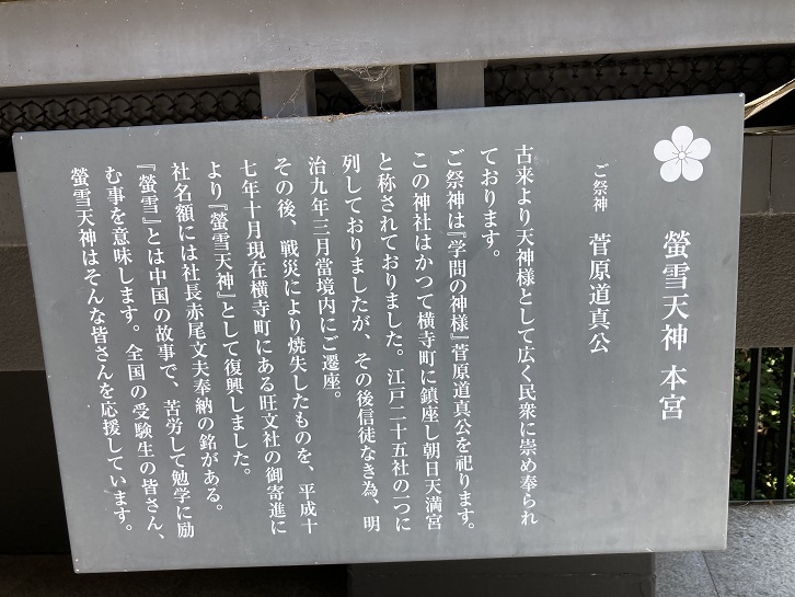 境内社の蛍雪天神本宮は簡素ながらも趣があります。同じような内容ですが、案内板が立っています。