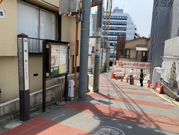 早稲田通りに下る御殿坂が築土八幡町にあります。坂上に案内柱が立っています。