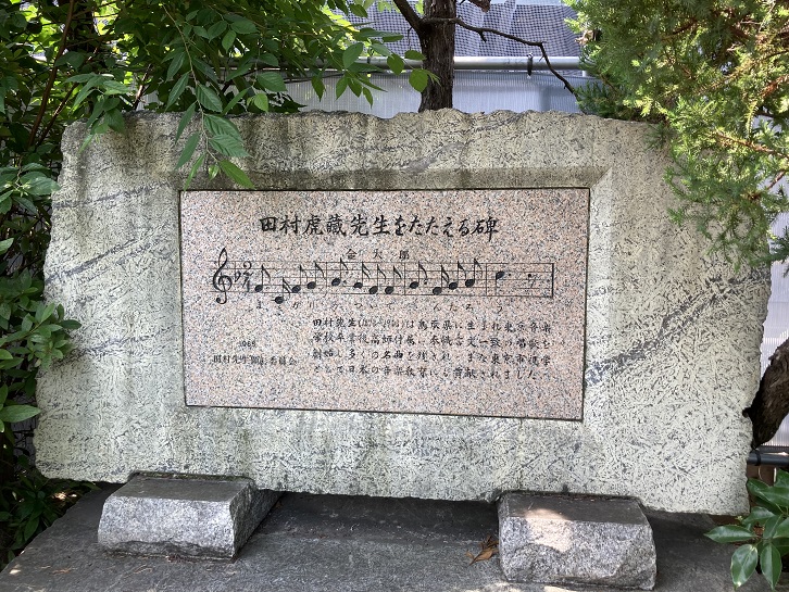境内の隅に、1965年に建立された顕彰碑が建っています。田村虎蔵は、唱歌「金太郎」や「浦島太郎」などを手がけた作曲家です。神社の裏手に住んでいたそうです。顕彰碑には、金太郎の楽譜と歌詞の一部が書かれています。