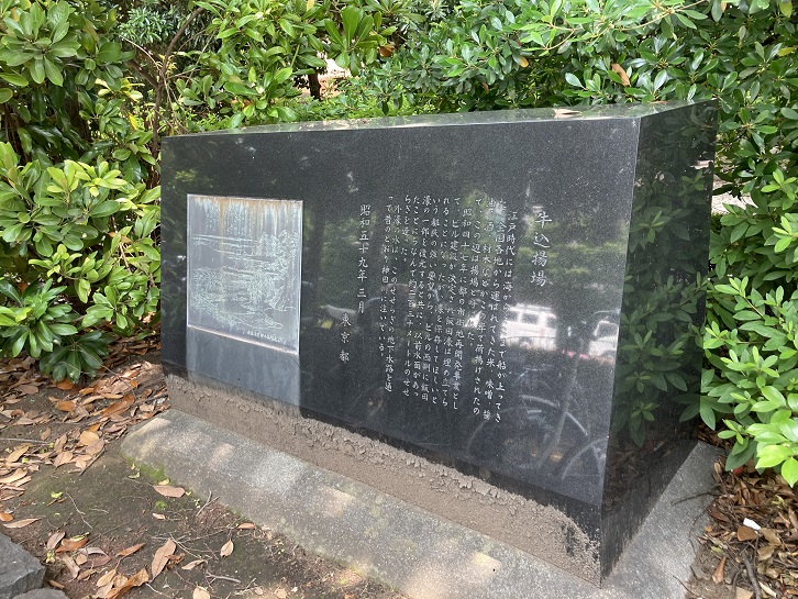 植え込みの中には、牛込揚場の石碑も置かれています。江戸市中に張り巡らされた掘を通って、海からここまで大量の荷物が運び込まれていたとは驚きです。