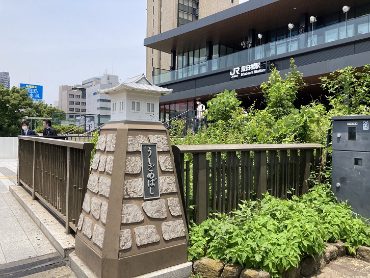 JR飯田橋駅西口の前に、ミニチュアっぽい牛込橋の親柱があります。牛込橋は江戸城防御のための外濠を跨いで架かっています。