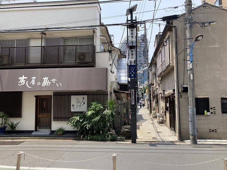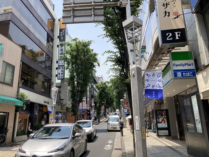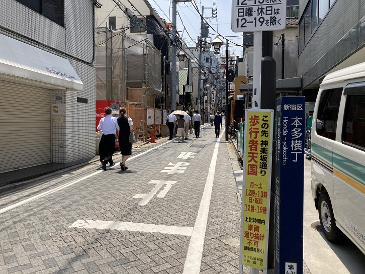 神楽小路から隣の神楽坂中通りを歩きます。神楽坂中通りは神楽坂通りから分岐する道路ですが、小路というには道路も歩道も建物もスッキリしています。通りの雰囲気もちょっとお洒落な感じです。