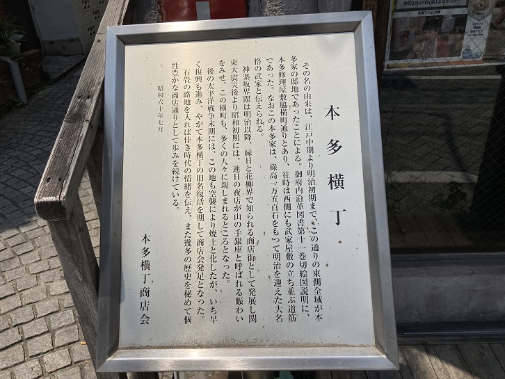 かくれんぼ横丁を抜けたところが本多横丁です。江戸中期から明治初期まで、この通りの東側全域が旗本の本多家の邸地であったことに因んで名付けられました。