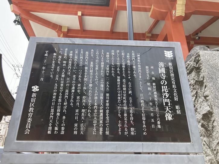「神楽坂の毘沙門さま」として、江戸時代より信仰をあつめた毘沙門天立像である。木彫で像高三十センチ、右手に鉾、左手に宝塔を持ち、磐座に起立した姿勢をとる。造立時期は室町時代頃と推定されるが、詳しくは不明である。加藤清正の守本尊だったとも、土中より出現したともいわれる。善國寺は、文禄四年(1595年)徳川家康の意を受けて日惺上人により創建された。この像は、日惺上人が鎮護国家の意をこめて当山に安置したもので、上人が池上本門寺に入山するにあたり、二条関白昭実公より贈られたと伝えられる。毘沙門天は、別名を多聞天と称し、持国天・増長天・広目天と共に四天王の一つである。寅の年、寅の月、寅の日、寅の刻に世に現れたといい、北方の守護神とされる。善國寺の毘沙門天は、江戸の三毘沙門と呼ばれ、多くの参詣者を集め、明治・大正期には東京でも有数の信仰地として賑わった。現在も、正月・五月・九月の初寅の日に毘沙門天を開帳し、賑わいを見せている。