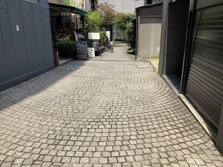 兵庫横町は善国寺のちょうど真向かいにあり、神楽坂通りに面したビルとビルの切れ間のほんの僅かな空間に人ひとり通るのがやっとの小路ともいえないような狭い通路です。狭い通路の先には石畳と黒塀の路地が続いています。戦国時代に牛込城の武器庫(兵庫)があったことが通りの名称の由来となっています。
