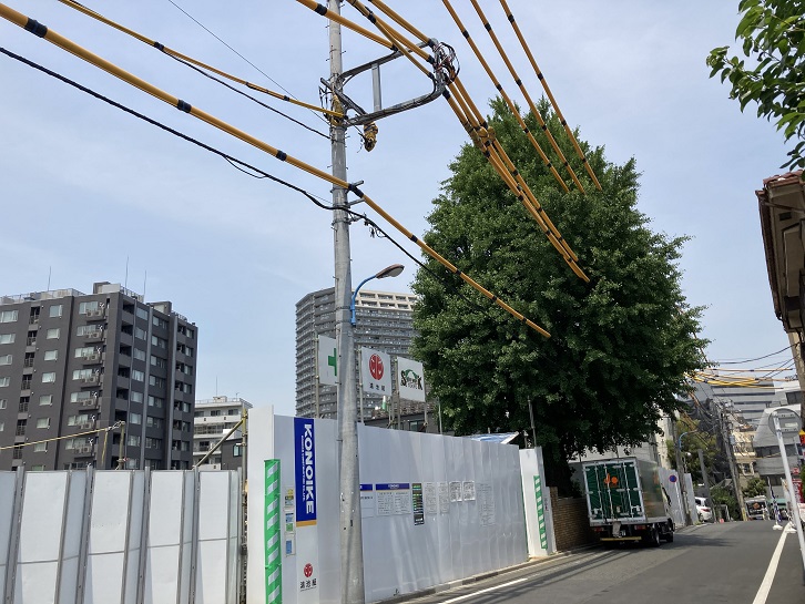 善国寺の脇から地蔵坂が延びています。坂の上には工事中の塀に囲われ、大きな銀杏の木が聳えています。樹齢250年以上と推定され、戦災の時に焼け野原となった中にこの銀杏の木が残り、それを目印に被災者の人が戻ってきたといわれています。幹には戦災の時の空襲の痕跡(裂け目)が残っています。「日本出版クラブのイチョウ」と呼ばれていましたが、日本出版クラブは2018年に神保町に移転し、現在は跡地にマンションが建設中です(歩いた時は)。