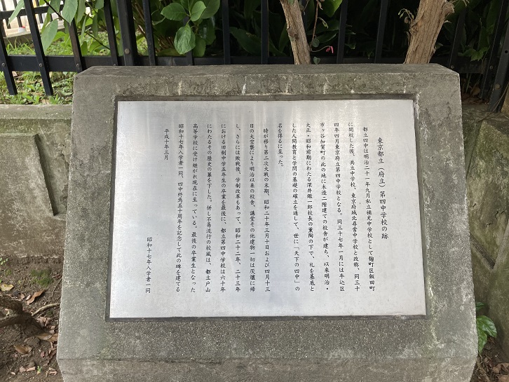 都立四中は明治二十一年九月私立補充中学校として麹町区飯田町に開校した後、共立中学校、東京府城北尋常中学校と改称、同三十四年四月東京府立第四中学校となる。同三十七年一月には牛込区市ヶ谷加賀町の此の地に木造二階建ての校舎が建ち、以来明治・大正・昭和前期にわたる深井鑑一郎校長の薫陶の下で、礼を基底とした人間教育と学問の基礎の確立を通して、世に「天下の四中」の名を得るに至った。時が移り第二次大戦の末期、昭和二十年三月十日および四月十三日の大空襲により明治以来の校舎、講堂その他建物一切は灰爐に帰し、さらには敗戦後、学制改革もあって、昭和二十二年、二十三年における旧制中学五年生の卒業を最後に、都立第四中学校は六十年にわたるその歴史の幕を下した。併し不易流行の校風は、都立戸山高等学校に受け継がれ現在に至っている。最後の卒業生となった昭和十七年入学者一同、四中終焉五十周年を記念して此の碑を建てる。
