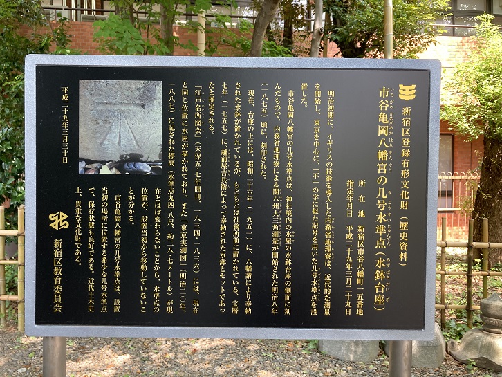明治初期に、イギリスの技術を導入した内務省地理寮は、近代的な測量を開始し、東京を中心に、「不」の字に似た記号を用いた几号水準点を設置した。市谷亀岡八幡宮の几号水準点は、神社境内の水屋の水鉢台座の側面に刻んだもので、内務省地理寮による関八州大三角測量が開始された明治八年(1875年)頃に、刻印された。現在、台座の上には、昭和二十六年(1951年)に、八幡講により奉納された水鉢が置かれているが、もともとは社務所前に置かれている、宝暦七年(1757年)に、越前屋吉兵衛によって奉納された水鉢とセットであったと推定される。「江戸名所図会」(天保五・七年間刊、1834年・1836年)には、現在と同じ位置に水屋が描かれており、また「東京実測図」(明治二十年、1887年)に記された標高(水準点94.8尺、約28.7メートル)が現在とほぼ変わらないことから、水準点の位置が、設置当初から移動していないことが分かる。市谷亀岡八幡宮の几号水準点は、設置当初の場所に位置する希少な几号水準点で、保存状態も良好である。近代土木史上、貴重な文化財である。