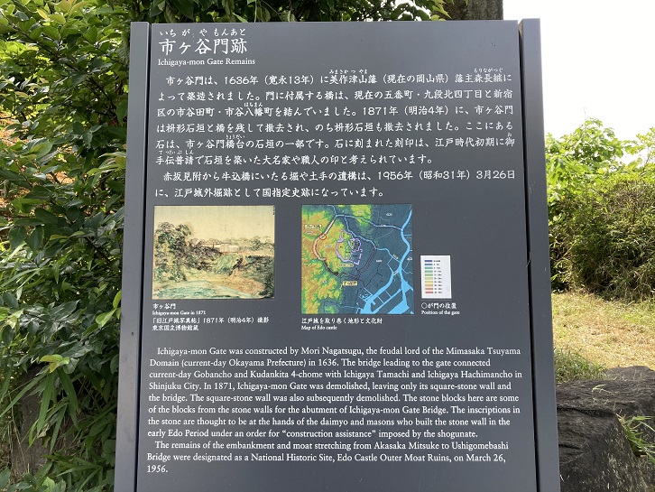 Ichigaya-mon Gate was constructed by Mori Nagatsugu, the feudal lord of the Mimasaka Tsuyama Domain (current-day Okayama Prefecture) in 1636. The bridge leading to the gate connected current-day Gobancho and Kudankita 4-chome with Ichigaya Tamachi and Ichigaya Hachimancho in Shinjuku City. In 1871, Ichigaya-mon Gate was demolished, leaving only its square-stone wall and the bridge. The square-stone wall was also subsequently demolished. The stone blocks here are some of the blocks from the stone walls for the abutment of Ichigaya-mon Gate Bridge. The inscriptions in the stone are thought to be at the hands of the daimyo and masons who built the stone wall in the early Edo Period under an order for "construction assistance" imposed by the shogunate. The remains of the embankment and moat stretching from Akasaka Mitsuke to Ushigomebashi Bridge were designated as a National Historic Site, Edo Castle Outer Moat Ruins, on March 26, 1956.