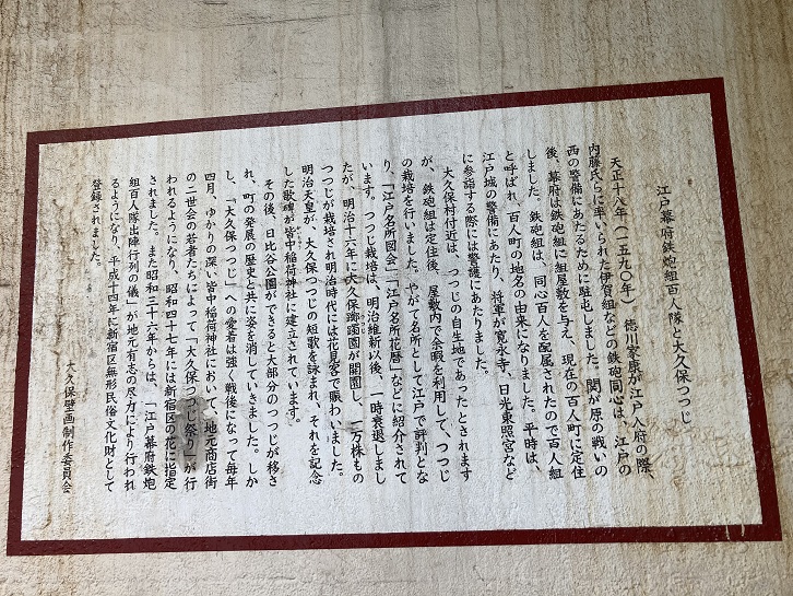 大久保駅北口の向かいのガード下の壁に、大久保駅が立地する百人町の由来を記した長大な案内板が掲げられています。百人町の町名は、かつて徳川家康を警護した鉄砲隊・百人組が駐屯していたことに由来します。