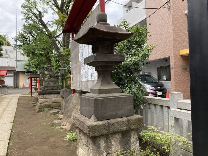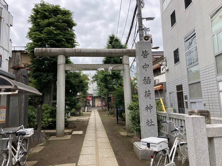 新大久保駅の手前に皆中稲荷神社があります。鉄砲組と縁のある神社ということで、神社名の「皆中」は、「皆中(みなあたる)」に由来しているとのことです。境内には、鉄砲組が奉納した鳥居や燈籠などが残されています。