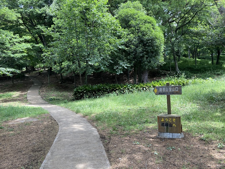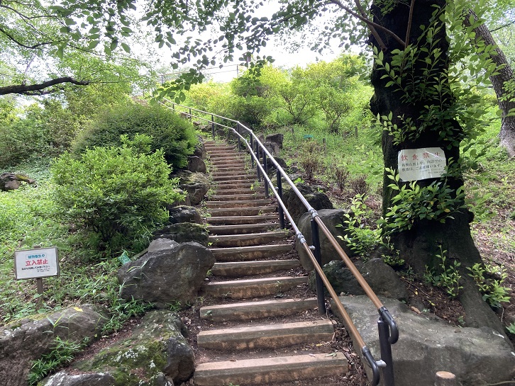 今回のコースには入っていないのですが、(突然大久保地区からワープして)箱根山地区を訪れます。10年位前に箱根山に登ったことはあるのですが、園内に入ると何処に箱根山があるのか分かりません。園内を迷いに迷ってようやく箱根山登山口の標識を見つけました。歩道(登山道)を進んでいきますと、目の前に手すり付の階段が現れます。やけに親切な登山道ですね。