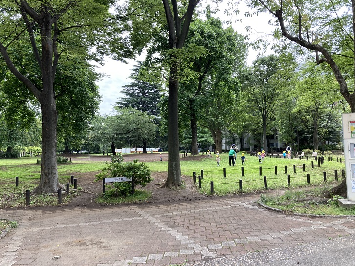 公園内には沢山の樹木が植えられていて(元々植わっていた?)、自然な緑の広場が広がっています。初夏の陽射しを遮り、幼稚園児の恰好の野外お遊びの場所になっています。園内には新宿スポーツセンターもあり、大人も運動が楽しめます。