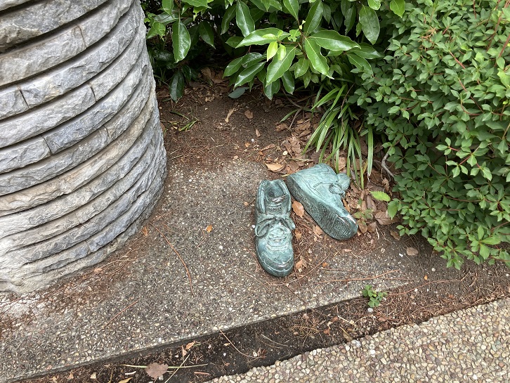 並木道の歩道の端に銅製の置物がさりげなく置かれています。蝸牛の置物は飾りのように見えなくもないですけど、脱ぎ捨てられた靴はちょっと不気味な感じがします。殺人事件の現場かっ!