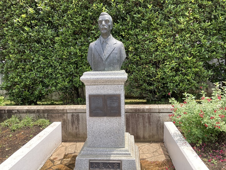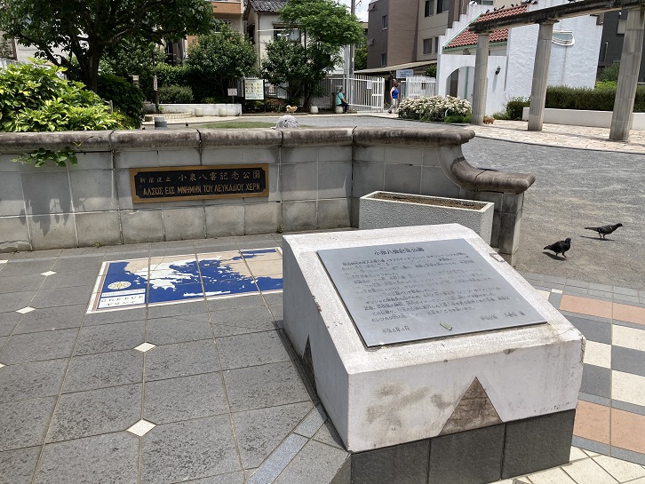 公園の中には小泉八雲の胸像と、当時のコンスタンティノス・ヴァシス駐日ギリシャ大使の寄稿文が書かれたプレートが貼ってあります。読み取りが難しかったので内容は省略します。
