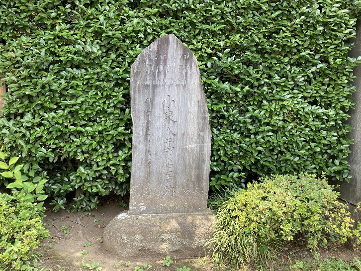 もうひとつ「小泉八雲終焉の地」の石碑が置かれています。石碑には、小泉八雲が住んでいた旧居の写真が添えられています。