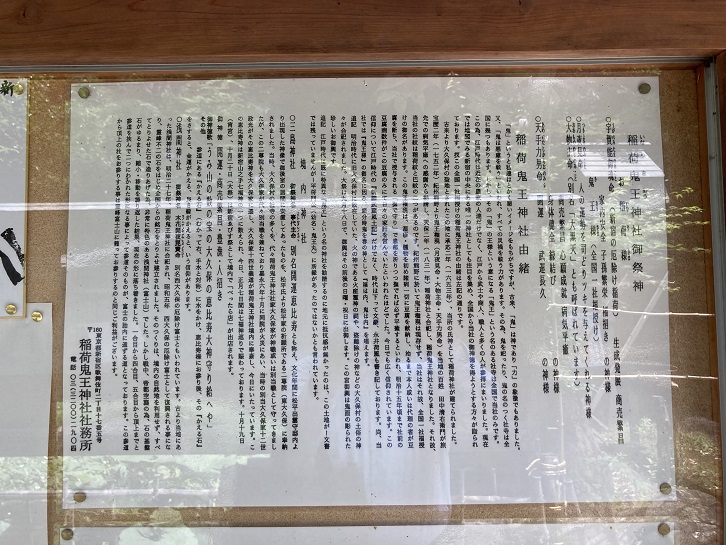 職安通りと交差する角に稲荷鬼王神社があります。普通、神社の由緒文は堅苦しい言葉で書かれていますが、鬼王神社は分かりやすい口語体で書かれています。印刷した紙をボードに貼り付けてあるのはちょっと重みに欠けますが。