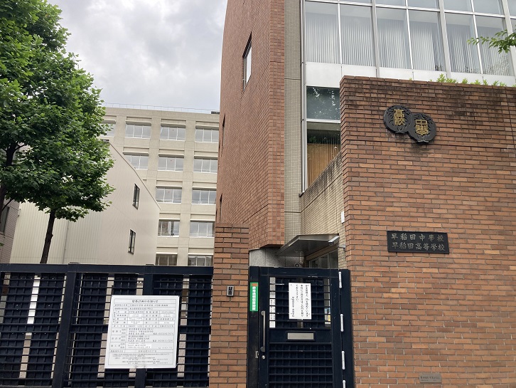 地下鉄の出口を出た直ぐ先に早稲田中学校・高等学校の校舎があります。名前の通り、中高一貫教育の男子校です。中高一貫校では、中学と高校でそれぞれ生徒を募集するところもありますが、早稲田校は中学校のみ生徒を募集する完全中高一貫校となっています。早稲田中学校・高等学校は、坪内逍遥・市島謙吉・金子筑水らが大隈重信の教育理念に基づき、東京専門学校(現在の早稲田大学)関係者と大隈重信の尽力により、明治二十八年(1895年)に創立されました。古くから「東洋のイートン校」を標榜し、「人格の独立」を謳い、リベラルを旨とする創立120年を超える伝統校です。尚、制服は男子校の伝統でもある金ボタン5個の黒学ランとなっています。ちょっと令和の時代にはそぐわなくなっていますね。