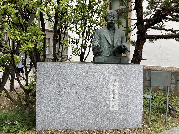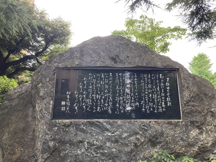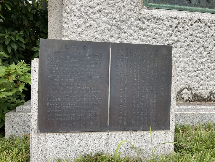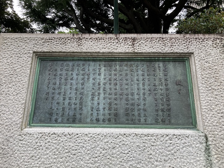 講堂の近くには、早稲田大学の校歌の歌詞を記したプレートが貼り付けられた巨石が置いてあります。なんか、私の中では早稲田の校歌と慶応の応援歌がごっちゃになっていますが、作詞したのは相馬御風で、明治時代から昭和時代にかけて活躍した日本の文学者です。「春よ来い」などの童謡の作詞者としても知られています。作曲したのは東儀鉄笛で、イェール大学の学生歌である「オールドイェール」の旋律を下敷きにしたといわれています。ネットで聴いてみたのですが、ほぼ丸写しといわれても納得できる旋律のように感じます。