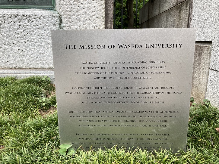 WASEDA UNIVERSITY HOLDS AS ITS FOUNDING PRINCIPLES. THE PRESERVATION OF THE INDEPENDENCE OF SCHOLARSHIP, THE PROMOTION OF THE PRACTICAL APPLICATION OF SCHOLARSHIP, AND THE FOSTERING OF GOOD CITIZENS. HOLDING THE INDEPENDENCE OF SCHOLARSHIP AS A CENTRAL PRINCIPLE, WASEDA UNIVERSITY PLEDGES TO CONTRIBUTE TO THE SCHOLARSHIP OF THE WORLD BY REGARDING FREEDOM OF RESEARCH AS ESSENTIAL AND DEVOTING ITSELF CONSTANTLY TO ORIGINAL RESEARCH. HOLDING THE PRACTICAL APPLICATION OF SCHOLARSHIP AS A CENTRAL PRINCIPLE, WASEDA UNIVERSITY PLEDGES TO CONTRIBUTE TO THE PROGRESS OF THE TIMES BY ESTABLISHING A PATH FOR THE PRACTICAL USE OF SCHOLARSHIP AS WELL AS PURSUING THEORETICAL RESEARCH FOR ITS OWN SAKE. HOLDING THE FOSTERING OF GOOD,CITIZENS AS A CENTRAL PRINCIPLE, WASEDA UNIVERSITY PLEDGES TO CULTIVATE PEOPLE OF CHARACTER WHO CAN RESPECT INDIVIDUALITY, DEVELOP THEMSELVES AND THEIR FAMILIES, BENEFIT THE NATION AND SOCIETY AND BE ACTIVE IN THE WORLD AT LARGE.