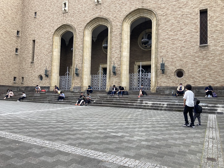 大隅講堂に入る石段は学生達の恰好の憩いの場になっています。こういう風景にも自由な校風が感じられます。講堂脇の植え込みの中に「早稲田の栄光」と題した学生歌の歌詞を刻んだ石碑が置かれています。ネットで聴いてみたのですが、全く知らないメロディーでした。早稲田大学の校歌は馴染みがありますけどね。ちなみに、「早稲田の栄光」は、昭和二十七年(1952年)の早稲田大学創立70周年記念事業の一環として、校歌以外に学生が歌えるカレッジソングをとして歌詞を公募し、当選した岩崎巌氏の詩に、西条八十氏による補助作詞と芥川也寸志氏による作曲が行われて完成したものです。それ以降、早慶戦に勝利した際や、卒業式の最後に歌う曲として歌い続けられています。