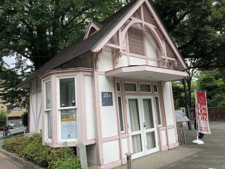 大隈講堂前の広場の奥に、こじゃれた雰囲気のカフェを備えた大学のグッズ売り場の建物があります。その前に、年代物の小屋が建っています。現在は大学の総合案内所として使われていますが、元はこの一帯にあった大隈重信邸の守衛詰め所だった建物です。明治時代の面影を残す木造平屋建ての建物で、急勾配の屋根にハーフティバーの瀟洒なデザインが目を惹きます。