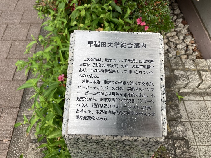 この建物は、戦争によって全焼した旧大隈重信邸(明治三十五年竣工)の唯一の現存遺構であり、当時は守衛詰所として用いられていたものである。建物は木造一階建ての簡素な造りであるが、ハーフ・ティンバーの外観、妻飾りのハンマー・ビームやがらり窓等が印象的である。小規模ながら、旧東京専門学校校舎(グリーンハウス・現在は追分セミナーハウスに移築)と並んで、木造校舎時代の雰囲気を伝える貴重な建築物である。