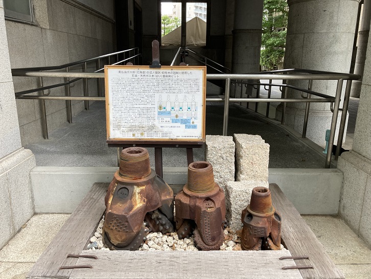 ビットとは、坑井(こうせい)を掘削する際に掘管(ほりかん)の先端に取り付けて坑底の地層を削りとる鑿(のみ)のような働きをする道具です。ここに展示されているものは、北海道の勇払油ガス田において、2005年に掘削された沼ノ端SK−6D号井で実際に使用された約40個のビットのうちの3つです。深い坑井を掘削する場合には、地表から目的とする層まで同じ直径のビットで掘り進むことはできません。同じ径のビットで地層を掘り続けると坑壁が崩れて掘進できなくなります。また、地層圧力が異なる地層に掘り込む時には、それまでに掘った地層をケーシングと呼ばれる鉄管で遮蔽して、新しく掘進する地層と隔絶しなければなりません。ケーシングをセットした後は、その内径よりも一回り小さい径のビットを使用してその先を掘り進みます。そのために1本の坑井を掘削するためにはいくつかのサイズのビットが必要になります。沼ノ端SK−6D号井では、36インチ(約91cm)ビットによる最表層の地層の掘削から始まり、ケーシングセットと掘削を交互に繰り返しながら順次坑径を小さくして、最深部の石油・ガス貯留層では8.5インチ(約22cm)ビットを用いて、4,500mを超える目的深度まで到達しました。勇払油ガス田では貯留層の深度が4,000〜5,000mもあるために、1本の坑井を掘削し終えるのに半年程度かかります。