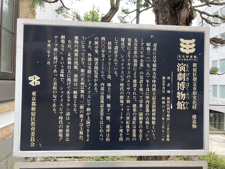 正式には早稲田大学坪内博士記念演劇博物館という。昭和三年(1928年)十月に呼内逍遙の古稀と「シェークスピヤ全集」の完訳を祝って学界・演劇界の有志千五百名余の協賛により建設された。建築の意匠は逍遙の発案によりイギリスのエリザベス朝(十六世紀後半)の様式で、シェイクスピア時代の劇場フォーチュン座を模して設計されている。鉄筋コンクリート造、地上三階、地下一階、建坪は約400平方メートで、内部は逍遙記念室をはじめ八つの展示室、図書閲覧室がある。また、外部は実際にシェイクスピア劇が上演できるよ