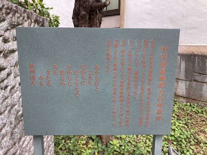 台座上の坪内逍遙胸像は、彫刻家・長谷川榮作氏の原型により昭和三十七年に鋳造されたもので、逍遙の「シェイクスピア」講義の姿である。また、台座は、早稲田大学後援会事業資金、池田恒雄氏、近桂一郎氏の協力により演劇博物館創立七十周年記念に建立され、歌碑の内容は逍遙を偲んだ會津八一の自筆の和歌である。