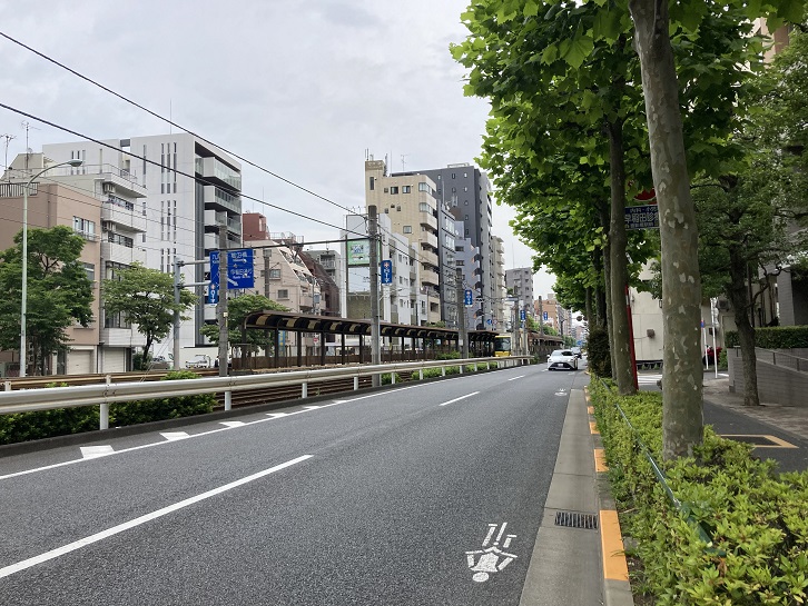 早稲田大学の構内を後にして、グランド坂を下って新目白通り上にある都電荒川線の早稲田電停に出ます。グランド坂という名前の由来は、昔このあたりに早稲田大学が設置した「戸塚球場」という球場があり、日本野球の草創期に学生野球を中心として使用されました。日本で初めて照明が設けられ、ナイターが行われた球場としても知られています。六大学野球でも使われ、海外からの交流試合もこの球場が使われていました。現在、その跡地は早大総合学術センターになっています。グランド坂という名前は、球場の名残りを残そうということで命名されたそうです。早稲田電停は、現在の新目白通りが拡幅されるまでは家並みに囲まれた専用軌道上にありました。新目白通りの道路拡幅時に沿線の家屋が移転し、都電の線路も線路が道路中央に位置するように移設され、現在のような位置になりました。新目白通りの高戸橋方面に向かう車道がかつての線路跡です。