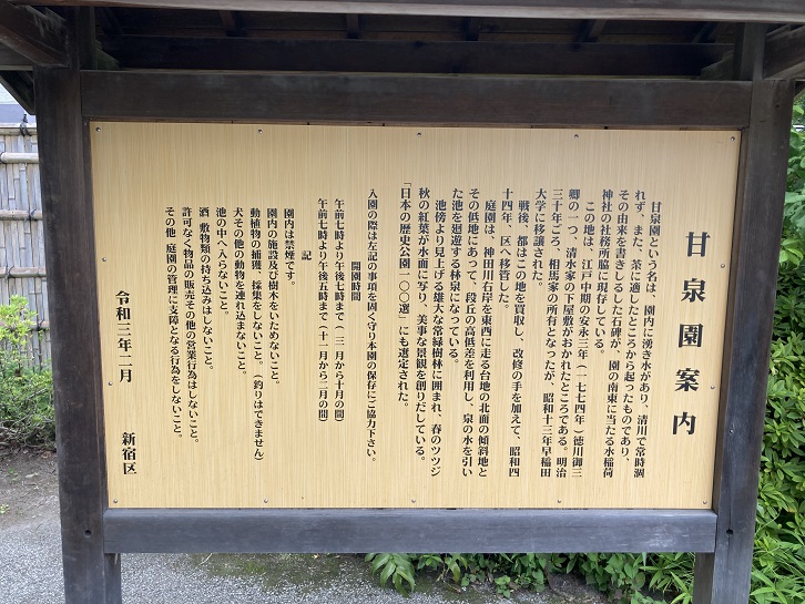 都電の面影橋電停の手前に都心のオアシス的存在の甘泉園公園があります。元々は徳川御三卿のひとつであった清水家の下屋敷があったところですが、屋敷に回遊式の大名庭園があり、そこから湧き出ていた湧水がお茶に適して評判になったことから「甘泉園」と呼ばれるようになりました。明治時代には相馬子爵家の邸宅になりましたが、昭和十三年に早稲田大学の施設となり、戦後は東京都に売却されて都立公園となりましたが、昭和四十四年(1969年)に新宿区の管轄となりました。甘泉園の名前の由来となった湧き水は既に枯れていますが、現在は大名屋敷の回遊式庭園の面影を残した日本庭園を主体とした公園になっています。冬になると雪吊した樹木が風情を添えます。甘泉園の由緒を記した石碑が水稲荷神社の社務所の脇にあったんですか?よく案内板を読んでおけば見落とさなかったのですが。