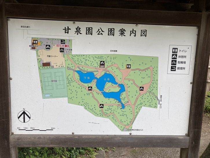 園内案内図を見ますと、公園の中央に「山吹の井」という瓢箪型の池があり、その池の南は急峻な崖に多くの樹木が樹生しています。