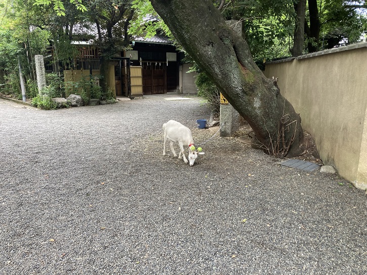 高田富士を見ようと、甘泉園公園に隣接している水稲荷神社に向かいます。神社の参道脇の門柱につながれたヤギさんがいます。食べ物を探しているのでしょうか?おやぁ、自慢の角に何かが刺さっています。よく見ますと、テニスのボールのようです。角で突かれて怪我をさせないためでしょうか?いいアイデアといえば、それはそうなのですけど。