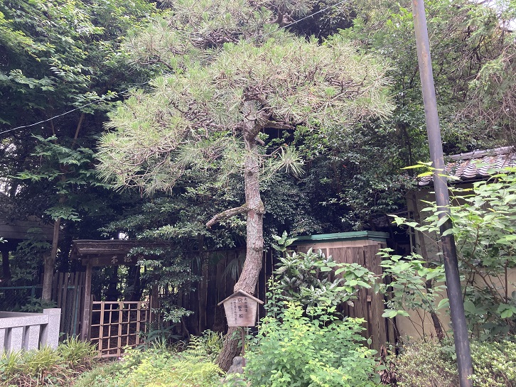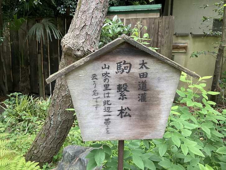 境内の奥に小ぶりな松の木が植わっています。その前に、太田道灌が馬を繋いだ松の木という案内板が立っています。「山吹の里」の伝説で、農家で簔を借りる際に太田道灌が馬を繋いだという松の木です。ただし、当時の松の木が500年の樹齢を経て残っている訳ではなく、現在の木は三代目とのことです。「山吹の里」には次のような伝説が伝わっています。