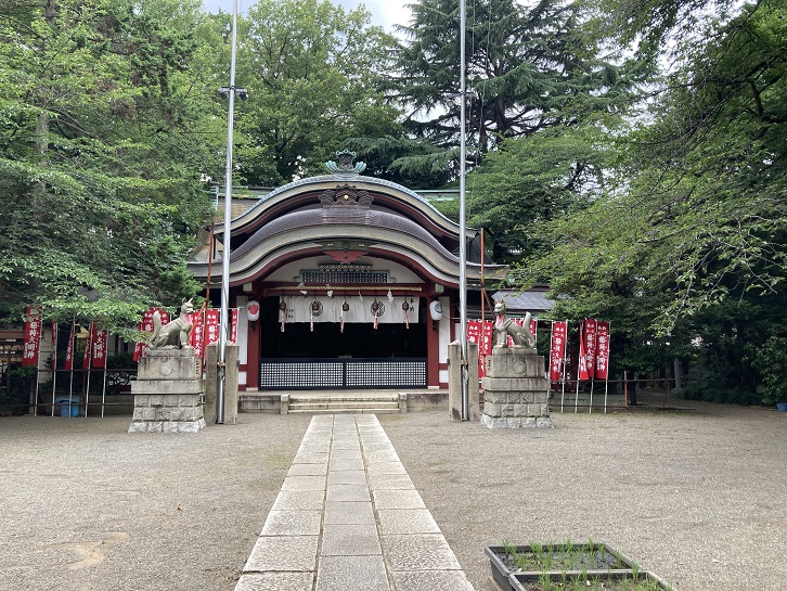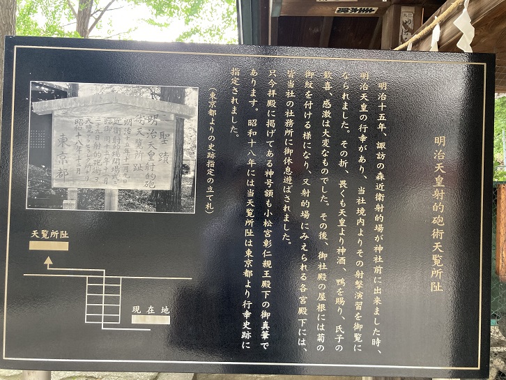明治十五年、諏訪の森近衛射的場が神社前に出来ました時、明治天皇の行幸があり、当社境内よりその射撃演習を御覧になられました。その折、畏くも天皇より神酒・鴨を賜り、氏子の歓喜・感激は大変なものでした。その後、御社殿の屋根には菊の御紋を付ける様になり、又射的場にみえられる各宮殿下には、皆当社の社務所に御休息遊ばされました。只今拝殿に掲げてある神号額も小松宮彰仁親王殿下の御真筆であります。昭和十八年には当天覧所阯は東京都より行幸史跡に指定されました。