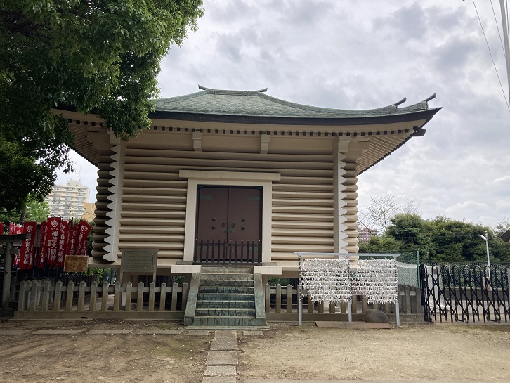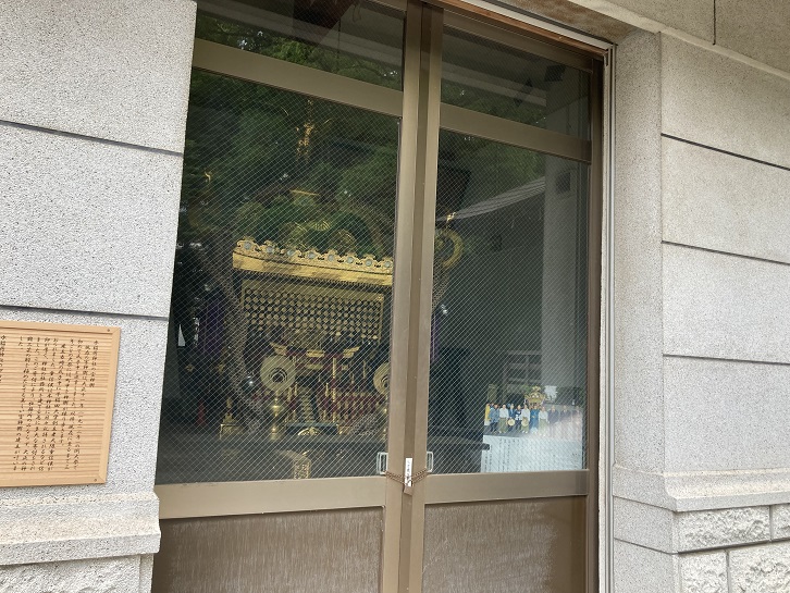 境内には立派な神輿庫が建っています。校倉造(あぜくらづくり)は、古代から近世にかけての日本で建てられた、伝統的な倉庫の建築様式です。主に寺院や神社において、宝物や経典などを納める倉庫に用いられてきました。高床式で、校木(あぜぎ)と呼ばれる木材を井桁に組んで積み上げた外壁が特徴です。この様式をコンクリートで実現するのは極めて珍しいとのことです。