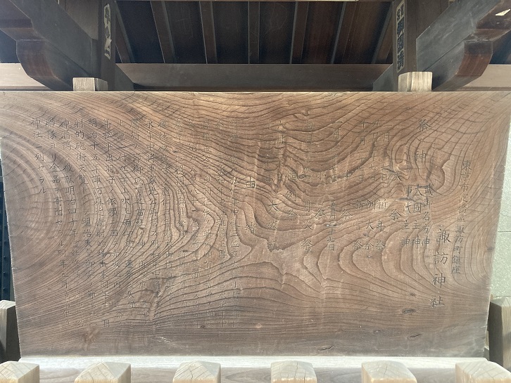 鎮座ノ儀ハ、弘仁年中、従三位左大弁小野篁(たかむら)朝臣、祭祀ト言。承和年中、眞雅僧正再営ト言。永承年中、源頼義父子奥羽征伐ノ時、祈願有テ凱陣ノ節、武器ヲ収ム。人皇八十二代後鳥羽院御(佇)。文治五年春、源二位頼朝郷奥州発向ノ時、祈願有テ凱陣ノ後、社殿造営ス。應仁三年春、太田持資再営ト言。寛永年中、将軍家光公再営ス。明和年中、将軍家治公鷹狩ノ節御成有。之當社ノ神ヲ御城庭ニ遷座ノ上意ニ付紅葉山吹上?御庭遷祭ス。天保十二年、松平出羽守ノ依頼ニ因テ赤坂邸内ニ遷祭ス。明治十五年、諏訪森近衛射的場出来、同年十一月、射的砲術天覧トシテ、明治天皇御幸ノ節、當社ヘ神酒鴨ヲ被献。明治四十年、當社修繕ノ際、近衛各聯隊ヨリ金品ヲ寄附セラル。同年五月??供?神社ニ列セラル。