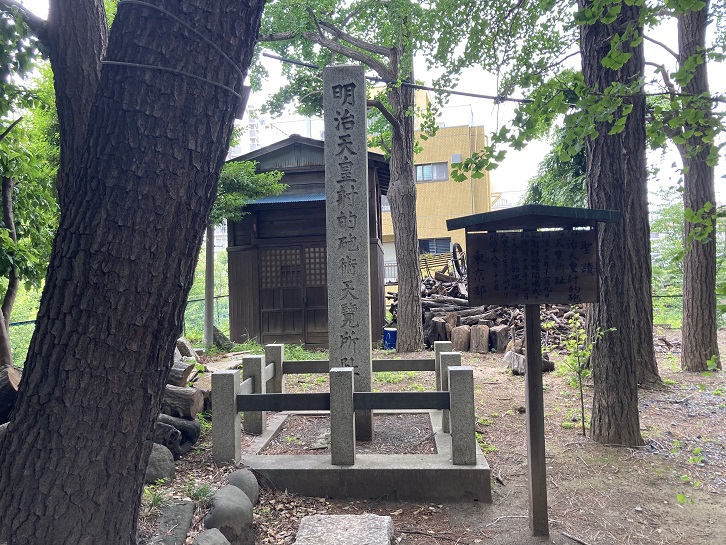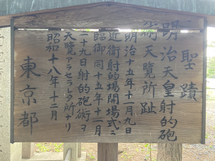 境内の隅に明治天皇が大砲の射撃演習を視察された際に使われた建物の跡が残っています。その入口手前には案内板が立っています。