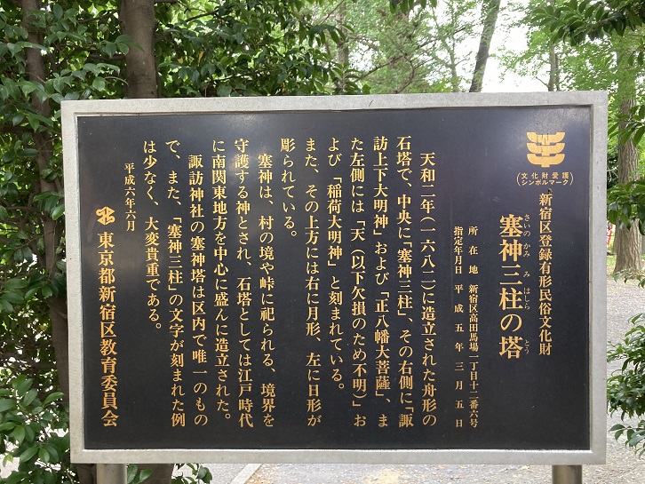 天和二年(1682年)に造立された舟形の石塔で、中央に「塞神三柱」、その右側に「諏訪上下大明神」および「正八幡大菩薩」、また左側には「天(以下欠損のため不明)」および「稲荷大明神」と刻まれている。また、その上方には右に月形、左に日形が彫られている。塞神は、村の境や峠に祀られる、境界を守護する神とされ、石塔としては江戸時代に南関東地方を中心に盛んに造立された。諏訪神社の塞神塔は区内で唯一のもので、また、「塞神三柱」の文字が刻まれた例は少なく、大変貴重である。