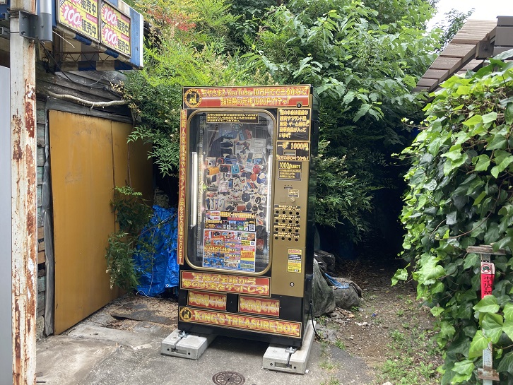 民家の横に派手なガチャが置いてあります。普通のガチャは百円玉で遊べますが、このガチャは千円札専用だそうです。そのためか、箱の中身は高級雑貨やブランド品、家電・ゲーム機などの高額商品が入っているとのことです。千円で高額な品物が出てくればいいのですけど、幼児向けの玩具が出てきたら困っちゃいますよね。ちなみに、高額商品が当たる確率は1/300なんだとか。
