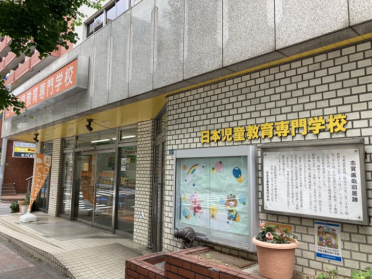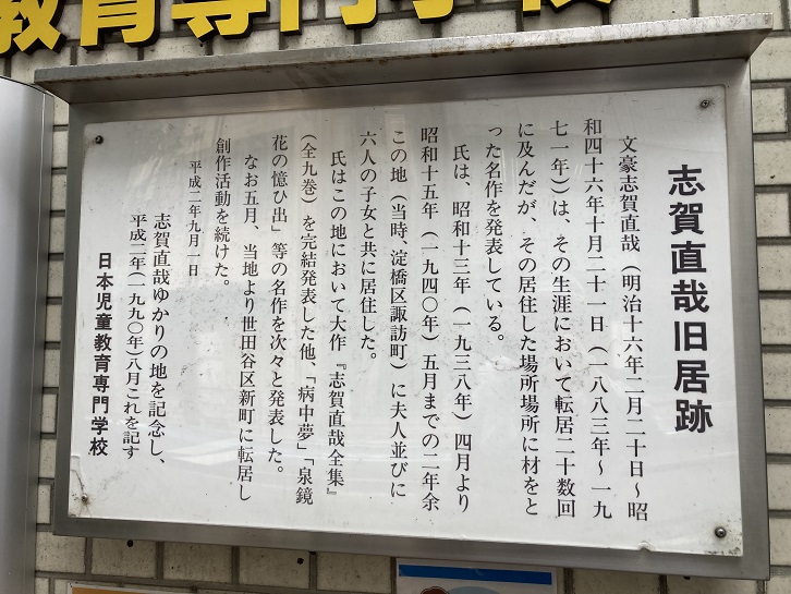 諏訪通りを進み、大久保スポーツプラザ入口交差点で右折して高田馬場駅に向かいます。日本児童教育専門学校の壁に、志賀直哉旧居跡の案内板が掲げられています。